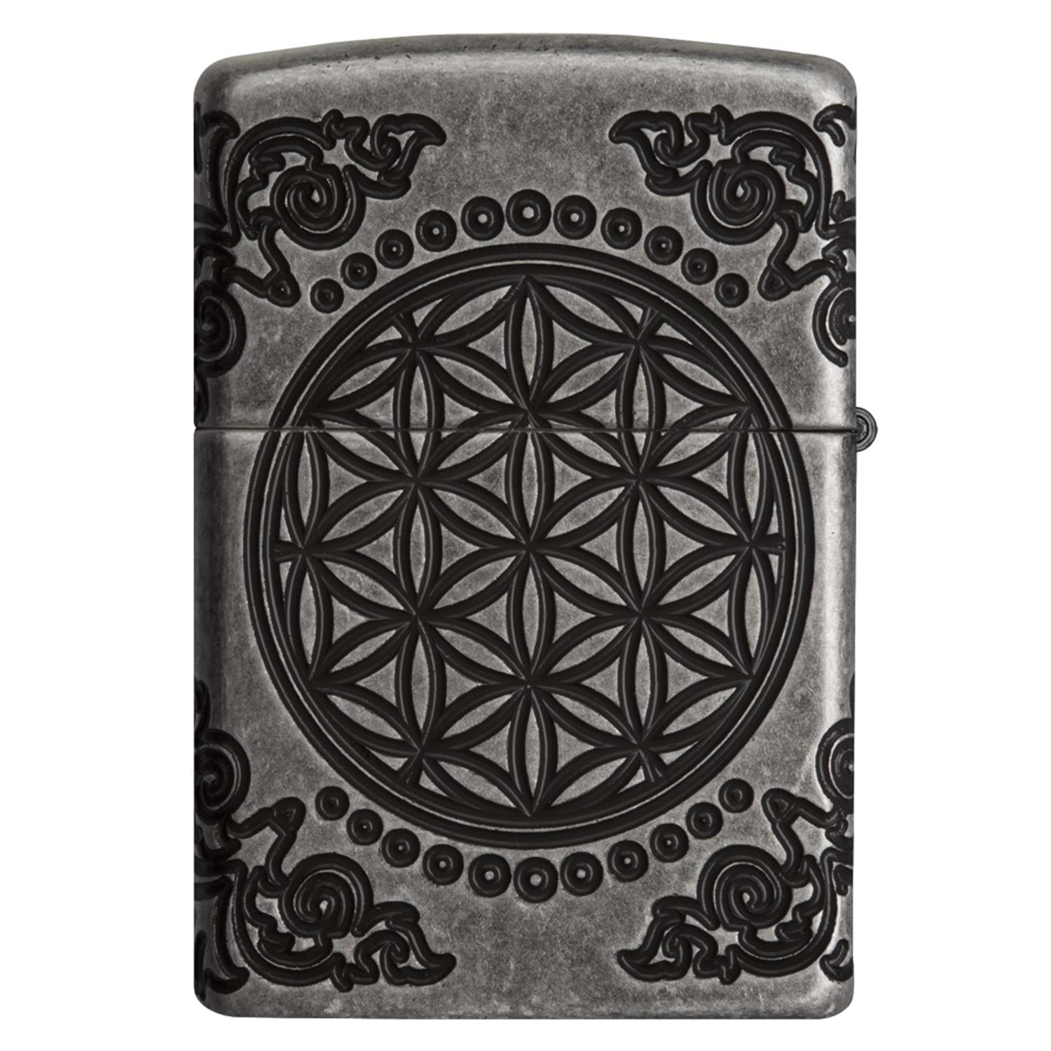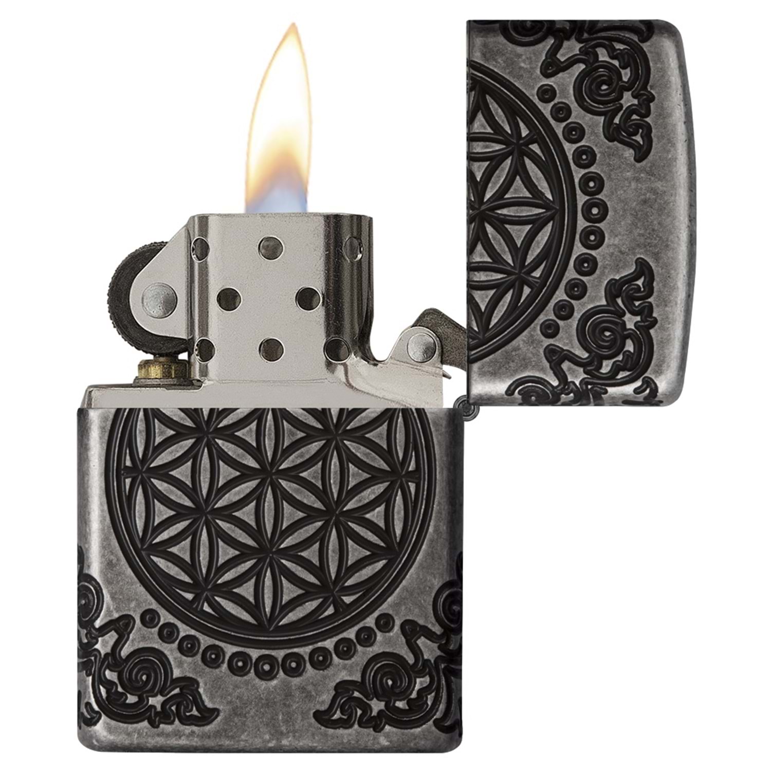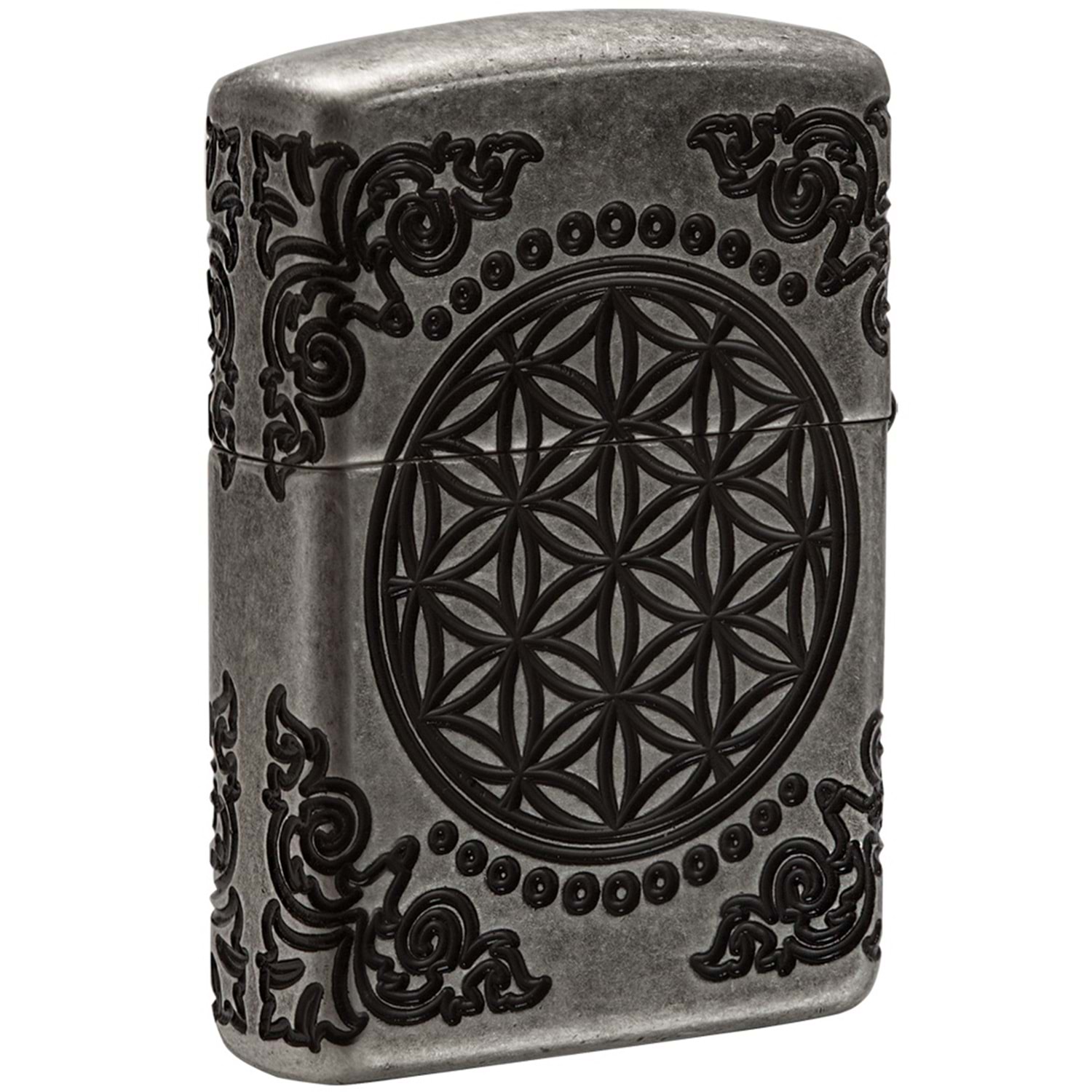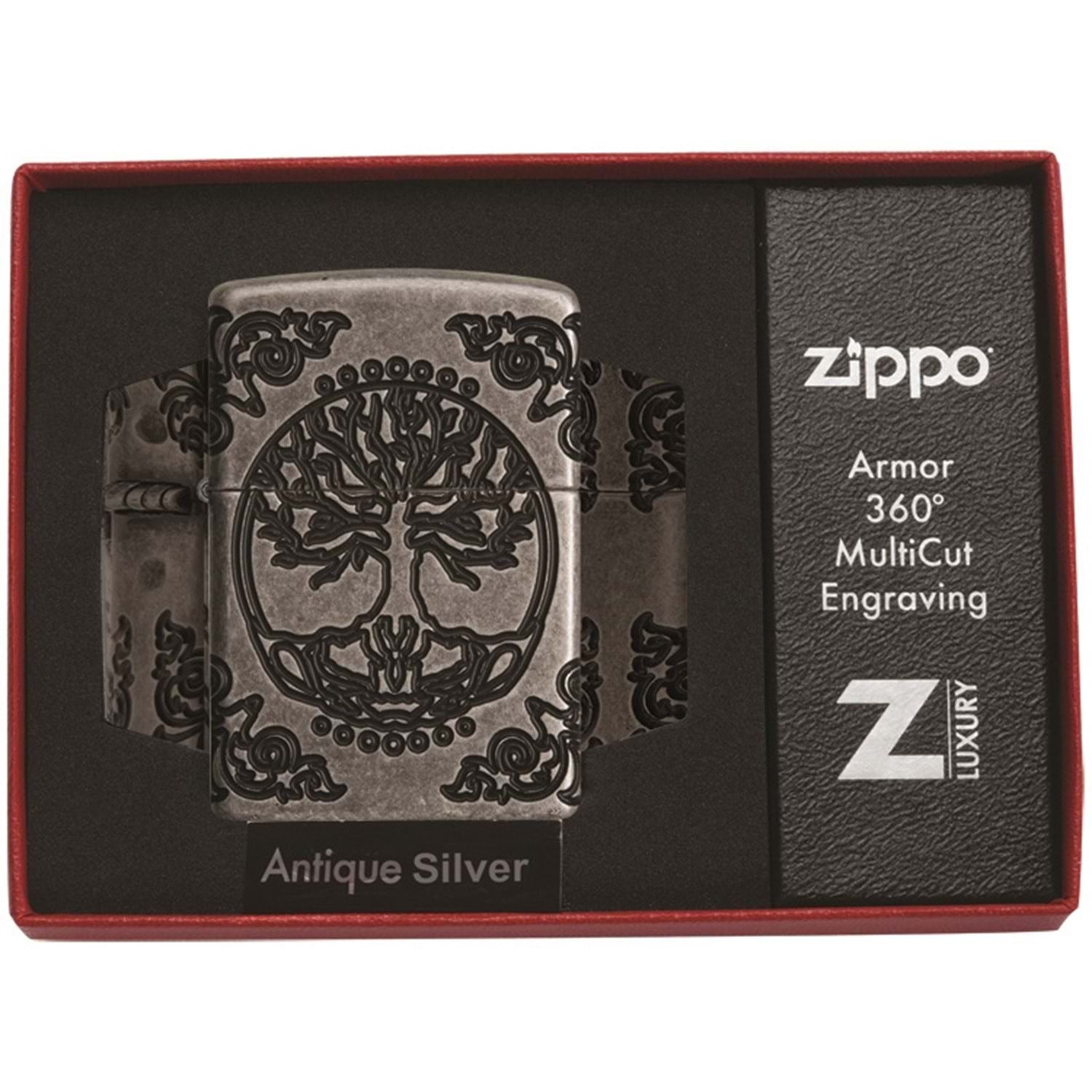 Armor ™ Antik Gümüş kaplama çakmağı üzerine yerleştirilmiş olan MultiCut tasarımı, her canlı, geçmiş, şimdi ve geleceği Dünya'ya bağlayan Hayat Ağacı'nı içeriyor. Kutsal geometrinin en eski örneklerinden biri olan Yaşam Çiçeği, bu çakmağın arkasında gösterilen zaman ve mekan arasındaki sonsuz bağı temsil eder. Lüks ambalajlama, Art Nouveau'dan ilham alan köşe dekorlarının çakmağın yanlarına sarılmış hissiyle, çakmak detaylarının daha iyi görüntülenmesini sağlıyor. En iyi performans için, Zippo çakmak benzini ile doldurun.