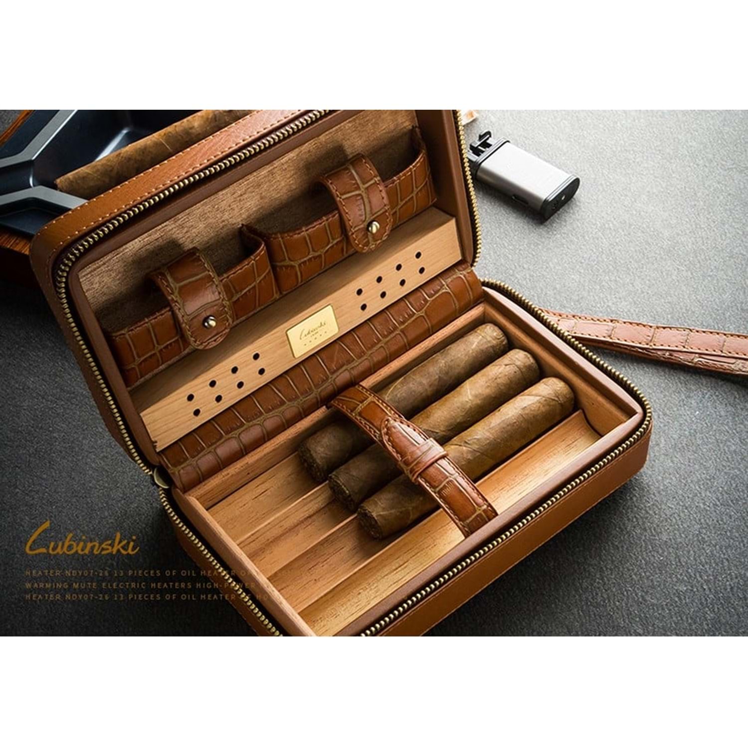 - Fermuarlı, içi sedir ağacından üretilmiş, 4 adet'e kadar büyük ring puro saklayabilen seyahat humidorunun yanında el askısı vardır.
