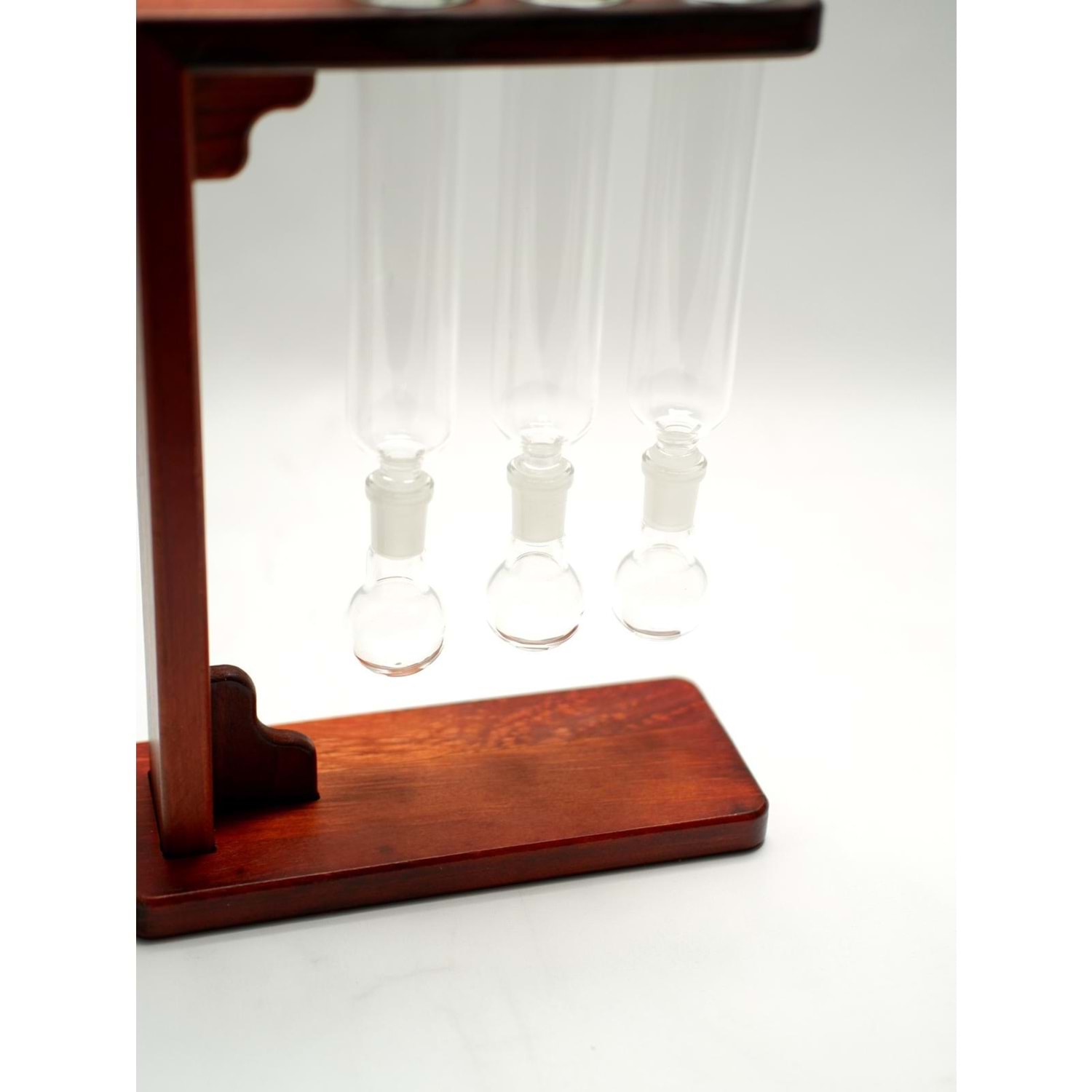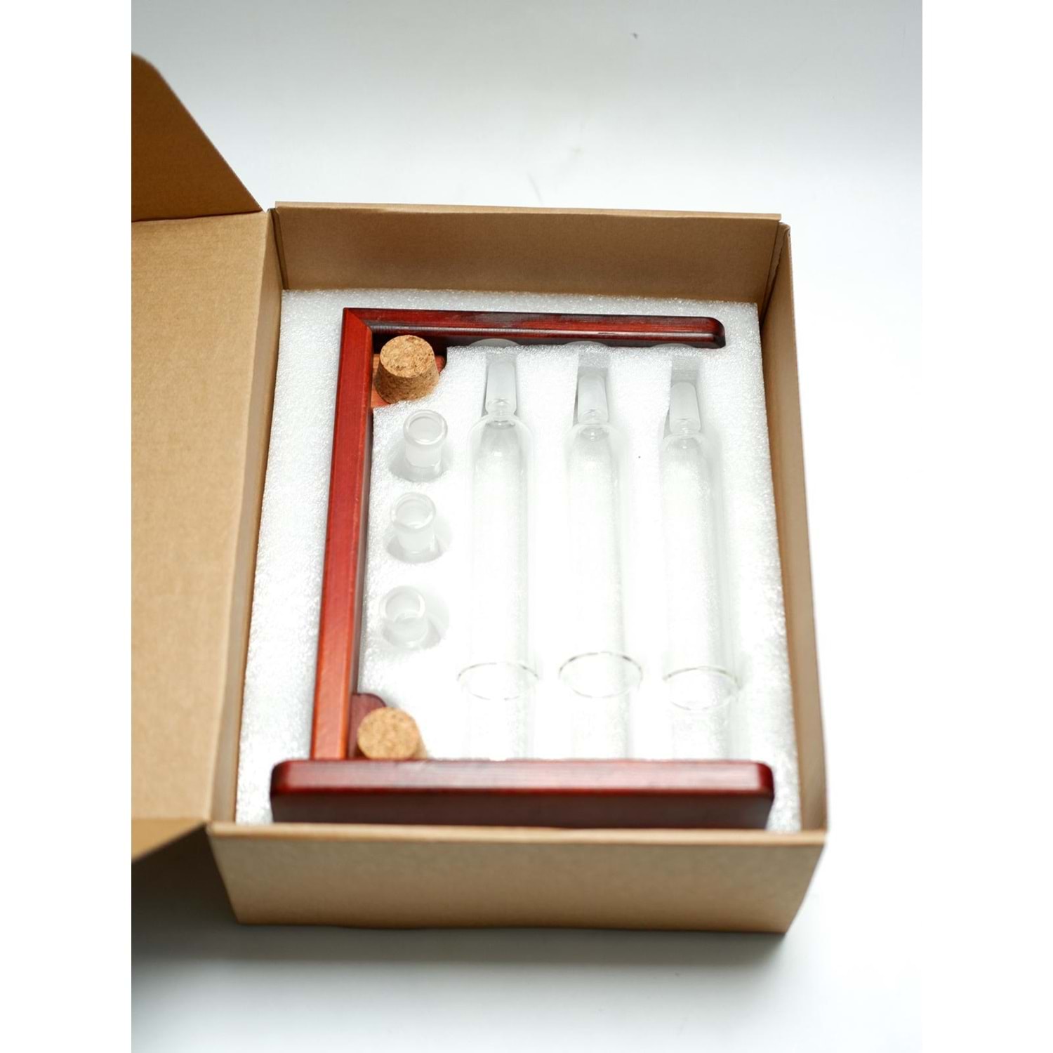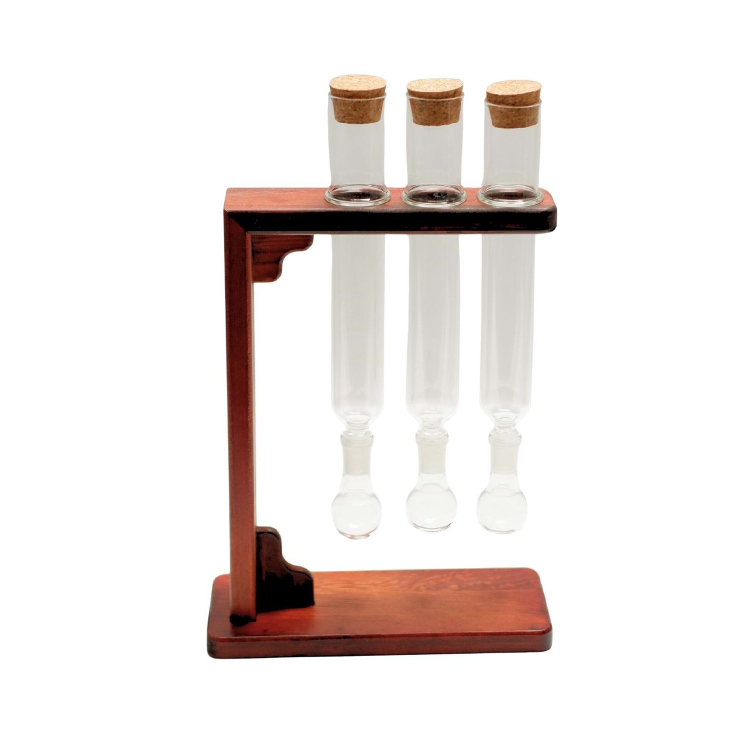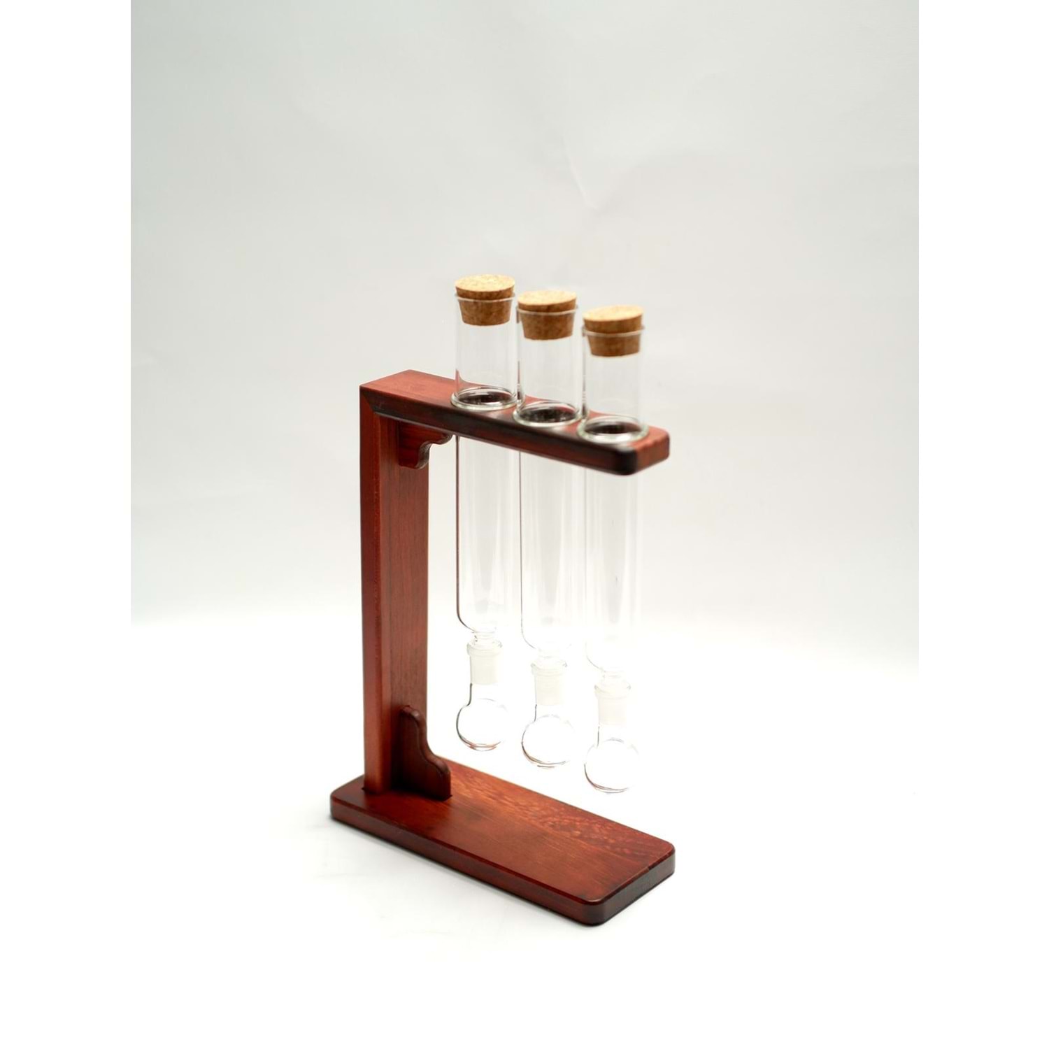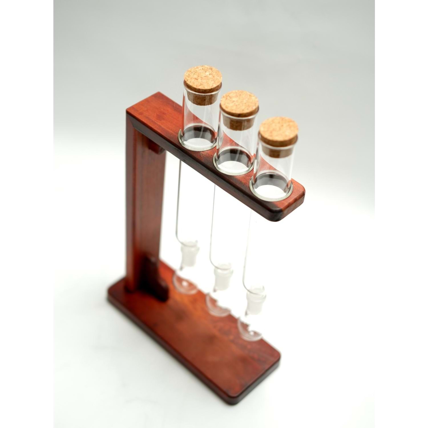 - Malzeme: Borosilikat cam tüpler, doğal ahşap stand