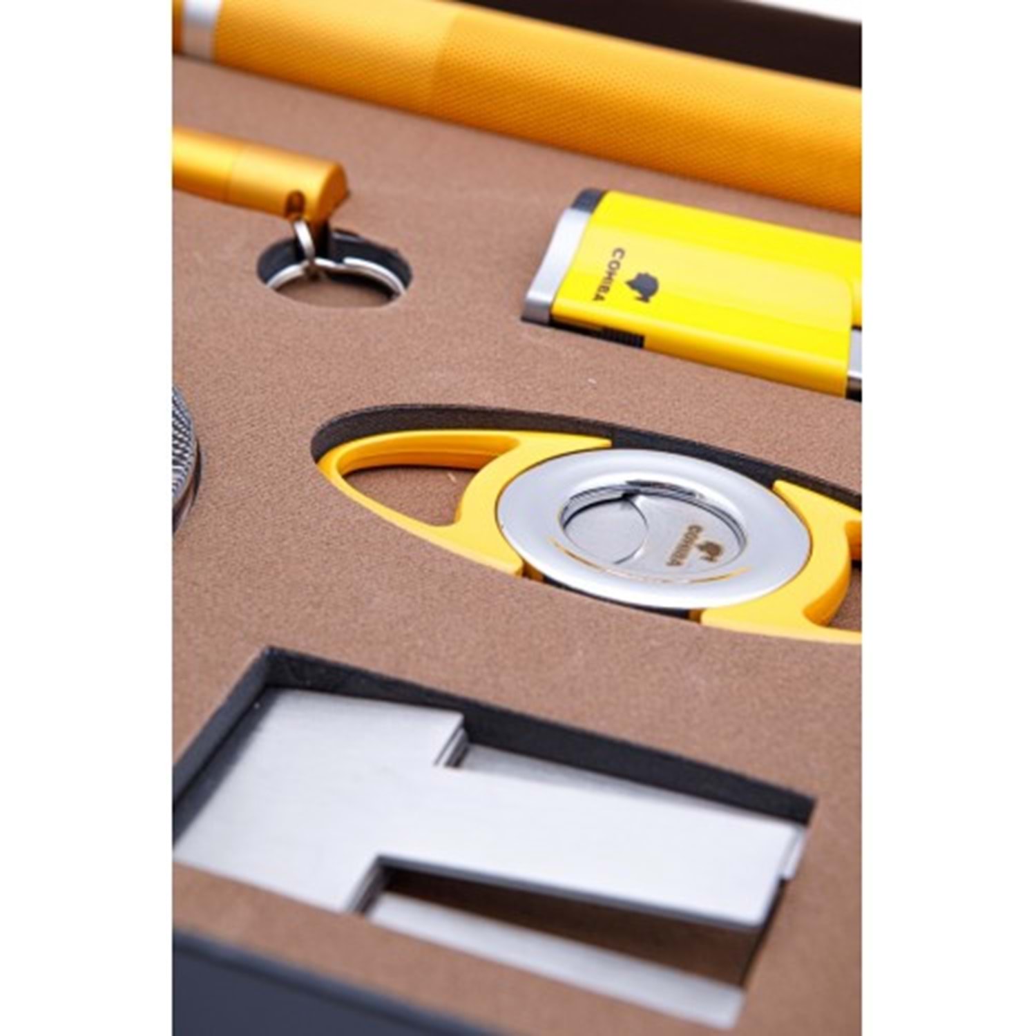 Cohiba Çakmak Kesici Tüp Küllük Delici Sehpa Altılı Sarı - Gümüş Puro Seti
